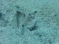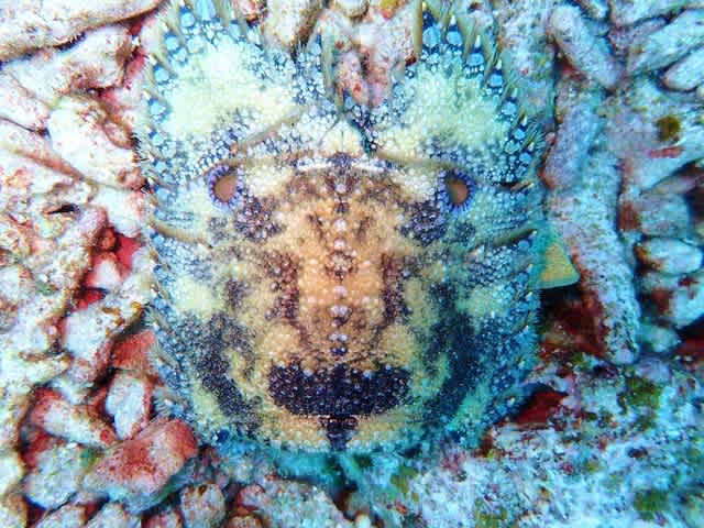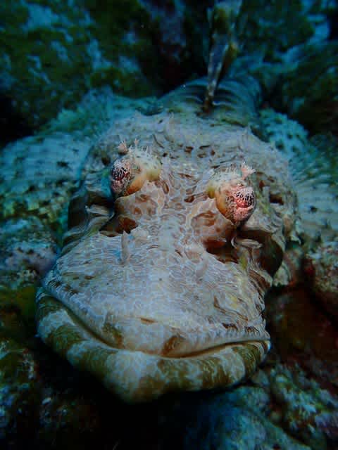 お日様が眩しすぎるのか 砂に埋まったオニダルマオコゼもナイス鬼顔でした