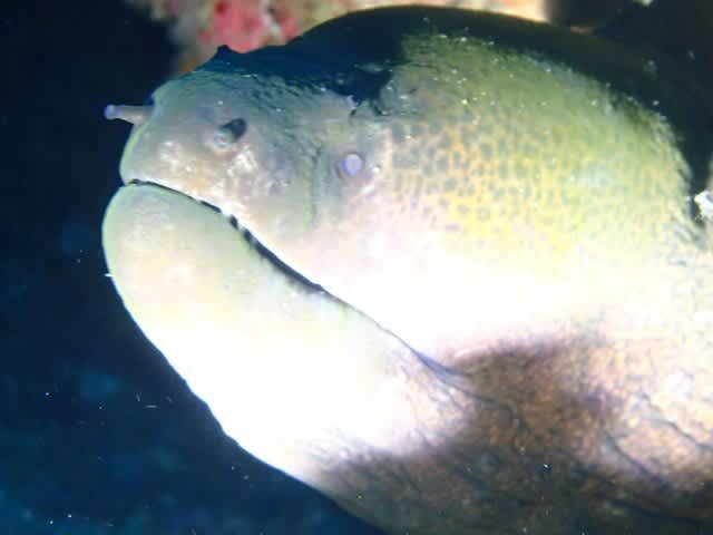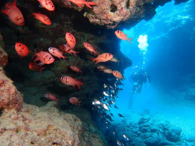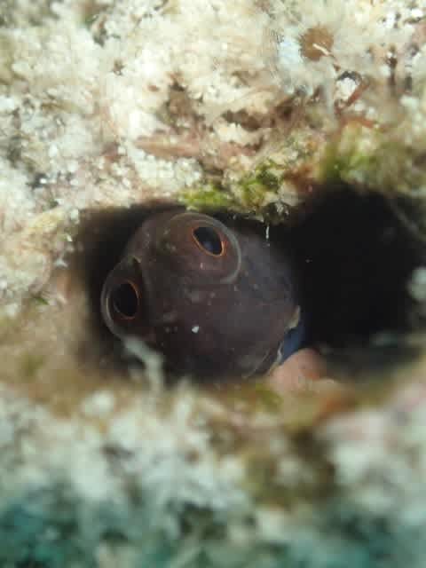 にんまり顔のニセゴイシウツボやカスミチョウチョウウオたち、洞窟の魚たちも群れててステキでした(^^)