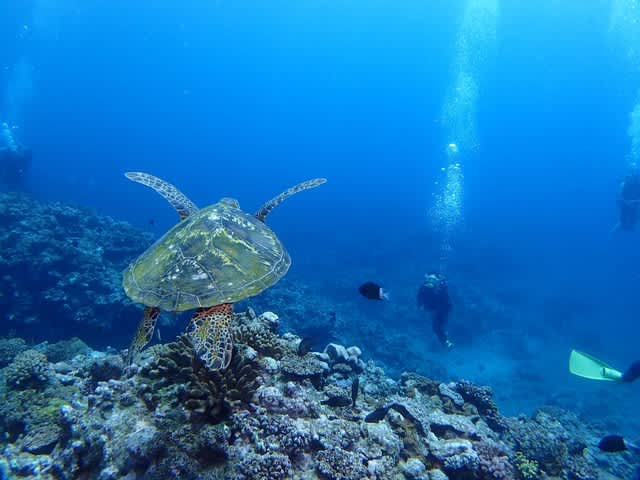 ダイバーと一緒にくるくると踊るように泳ぐカメさんや