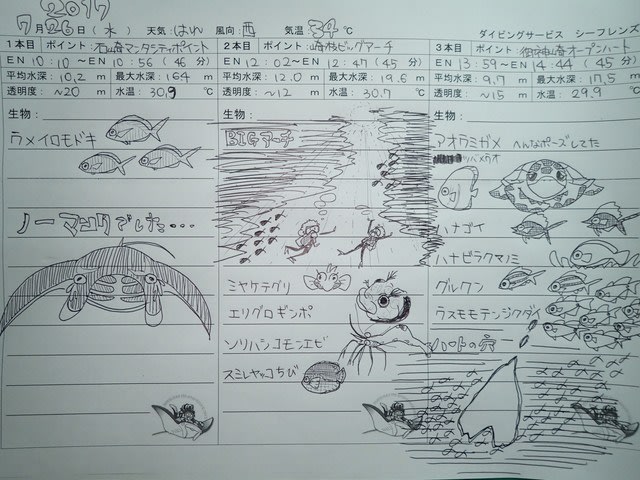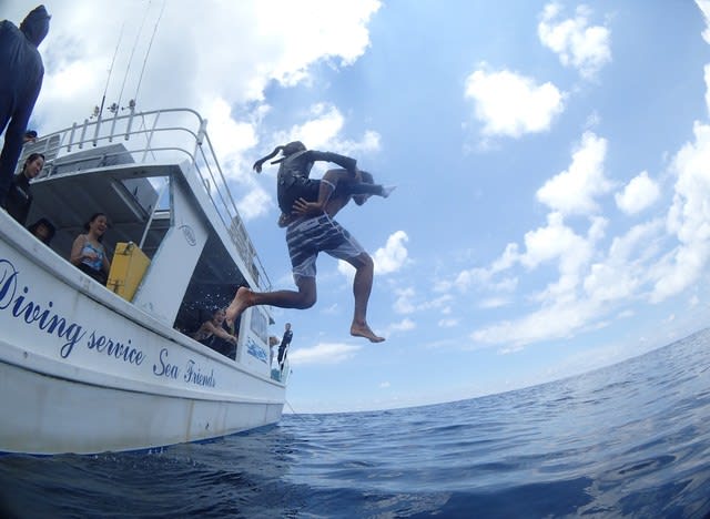 コンディション:晴れ時々曇り 南の風 波4m 気温32℃ 水温28℃ 透明度~20m