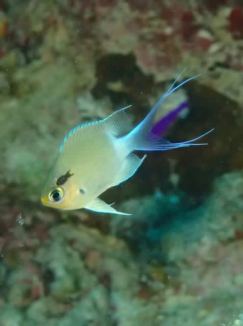 しっぽ美人のマルスズメダイ幼魚は おでこにお魚の形をしたバッジをつけていました(^u^)