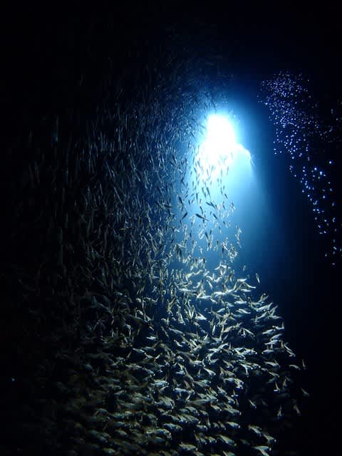魚をかき分けてアーチに入ってもまだまだ群れむれで、群れに光が