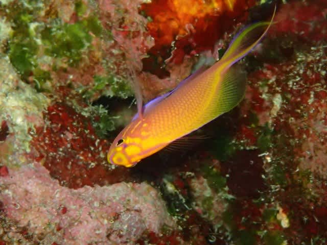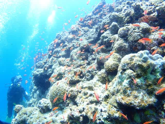 岩肌にたっぷりと住み着くオレンジのハナダイの舞が何とも賑やかで美しい!!!!