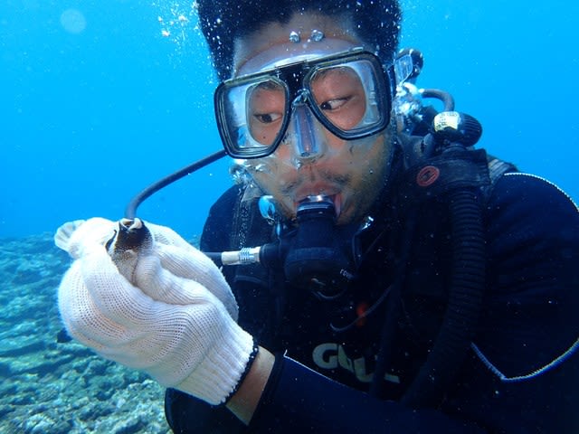 初めてさわるナマコにちょっとビビってましたけどね~(^ム^)