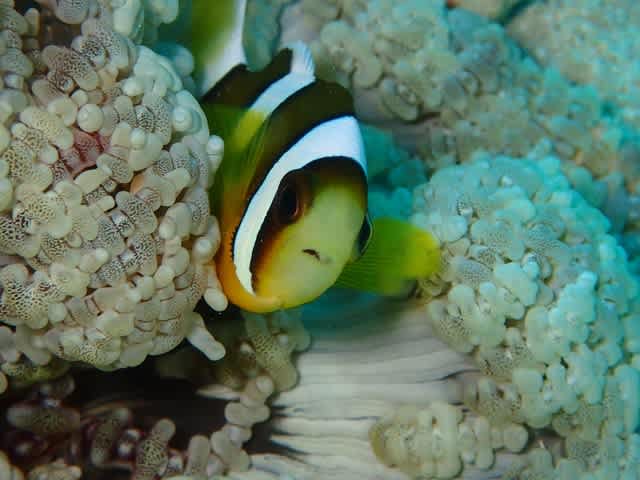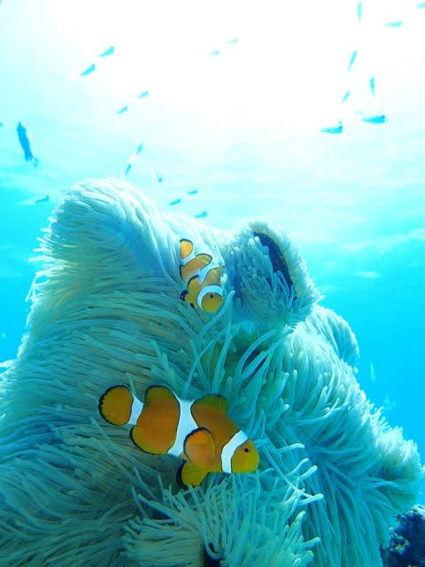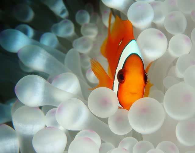 白いイソギンチャクの波でサーフィンするカクレちゃんや~
