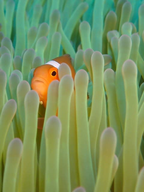 水中では 意外とおこりんぼうな表情のハマクマノミが出迎えてくれました☆