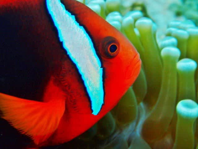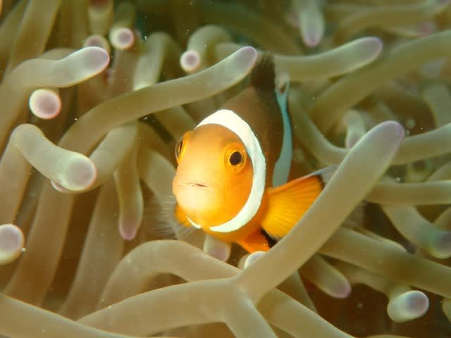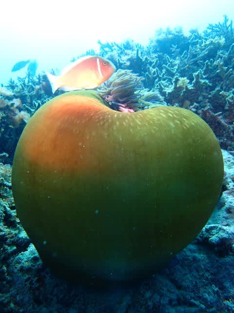 リンゴの形をしたステキなイソギンチャクにハナビラクマノミがすんでました~(´∇`)