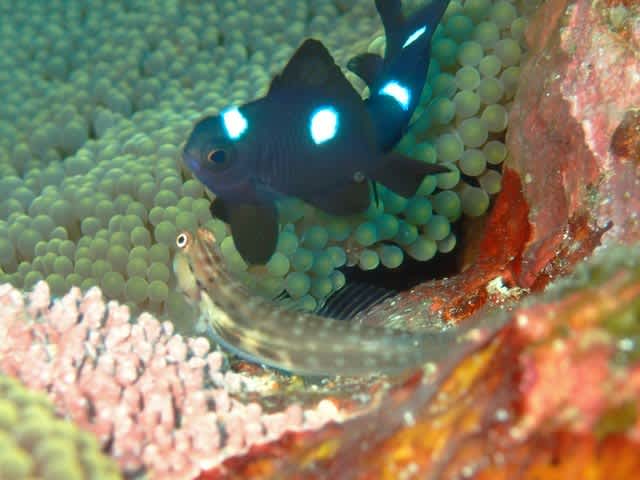 ふと 下を見ると ミツボシクロスズメダイ幼魚とイシガキカエルウオが井戸端会議中??