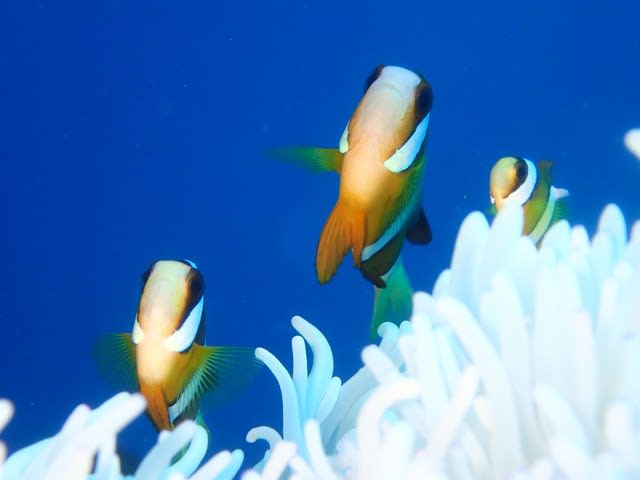 ブルーの海バックにクマノミトリプル~ずも にゅっとポーズ♪♪