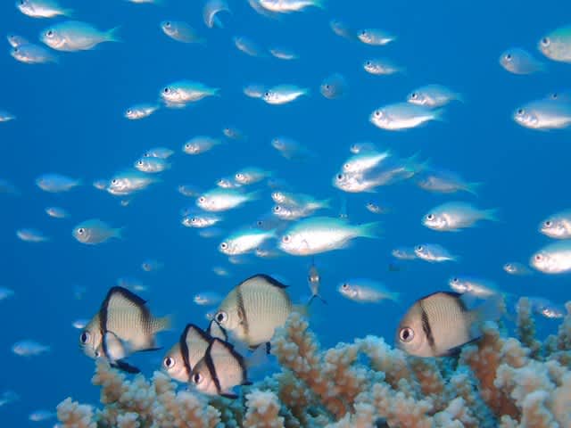 デバスズメダイのちびちゃんがあちらこちら群れて可愛いキレイですね☆☆