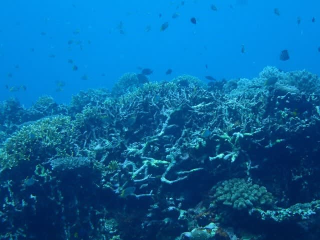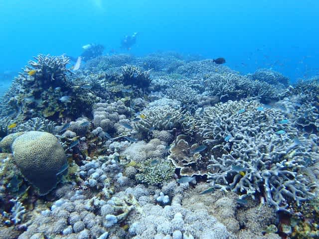 カラフルなサンゴの丘をのんびりお散歩🐕🎵魚も多くにぎやかですね(^^)/