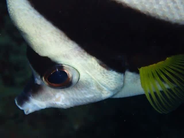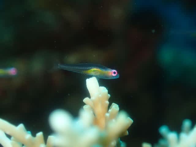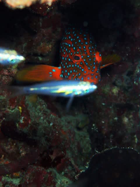 同じ暗がりには ニシキヤッコの幼魚もいましたよ💡背鰭の青い目がなんとも美しいですね🎵