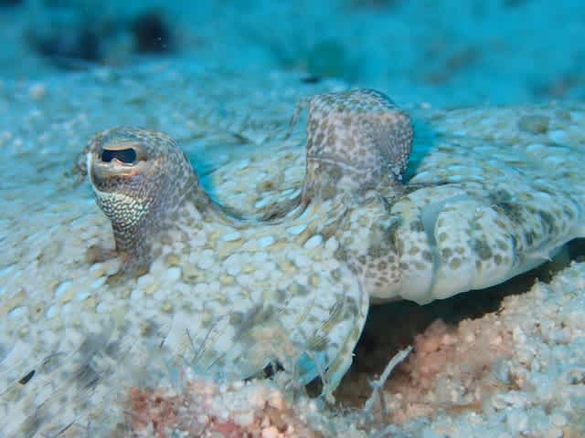 砂に潜むトゲダルマガレイ👀!! 体が花柄ですね~🌼🌼
