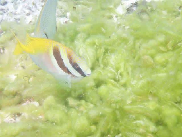 緑の海藻大発生ゾーンでは サラダバーに夢中な お目めキラキラ✨嬉しそうなヒメアイゴ🍴
