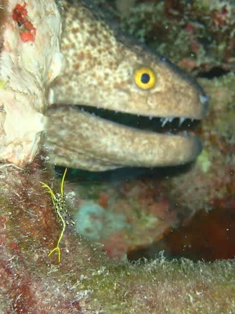 ミカヅキコモンエビのクリーニング待ちをしている にっこりウツボ先輩