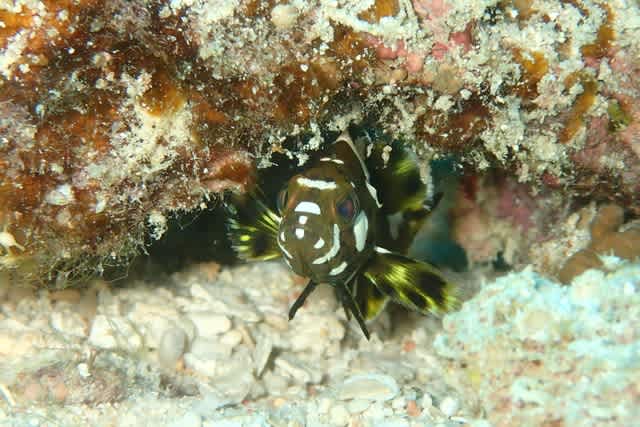 こっそりこちらを見ていたのは 牛柄のシロブチハタ幼魚ちゃん!!