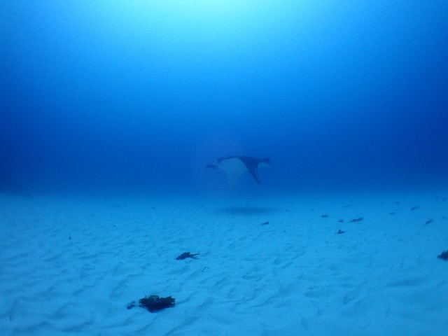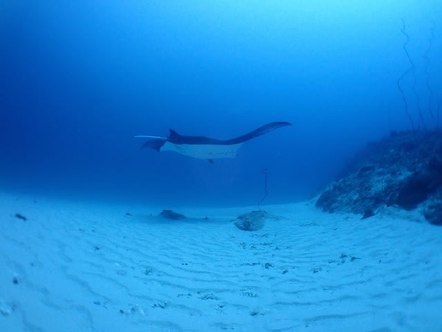 良い感じ流れの中をマダラトビエイが登場した後に大きなマンタが二枚登場です!!!!一枚すぐに去って行きましたがもう一枚は砂地の上でのんびりクリーニングされてましたよ(^.^)