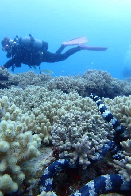 ウミヘビがソフトコーラルの隙間からダイバーを興味深そうに見ていてほっこり~♨♨