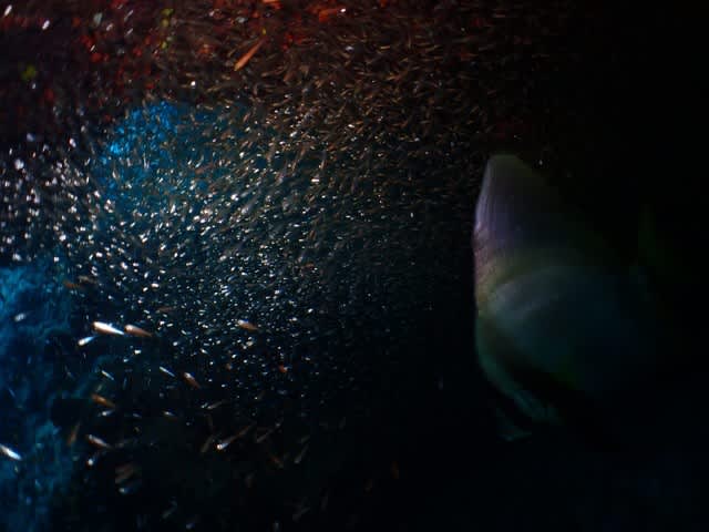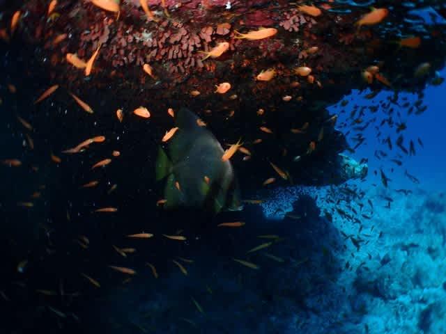 本日の一本目は、キノコサンゴの下に沢山のウスモモテンジクダイの群れに混ざり