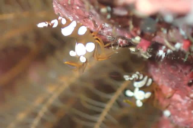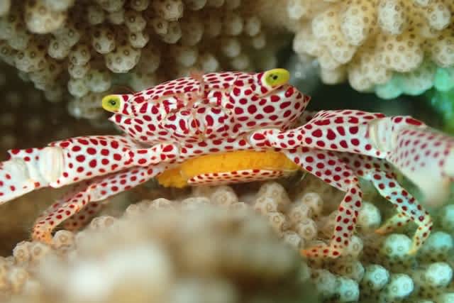 パラオクサビライシの水玉に隠れていた コノハガニ