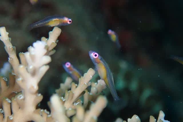 サンゴの止まり木にちょこんと アカメハゼ
