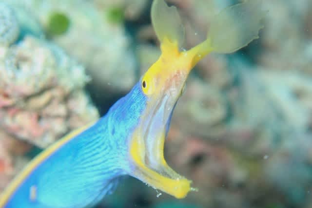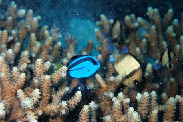 大きなサンゴとヨスジフエダイのコラボレーションにも癒されて