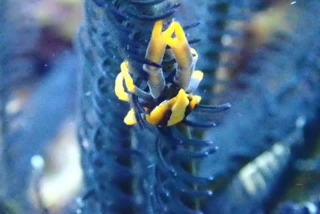 ウミシダに隠れる、コマチコシオリエビ