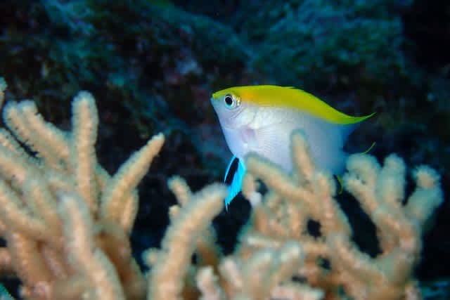 ソフトコーラルに隠れていた クロスズメダイ幼魚