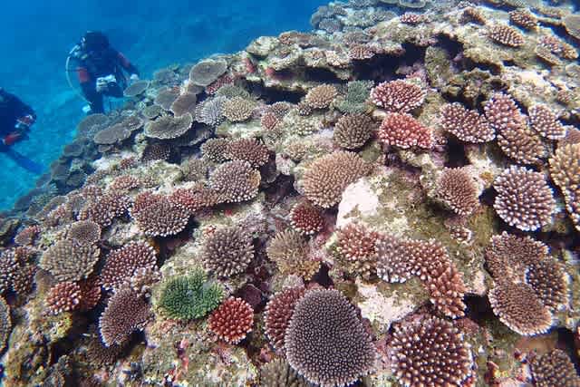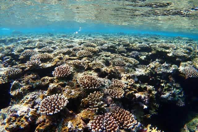 ぴかぴかと反射する水面 元気に枝を伸ばす赤ちゃんサンゴたち