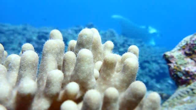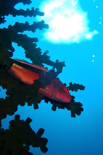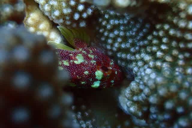 太陽バックのナンヨウキサンゴに宿るホシゴンベ