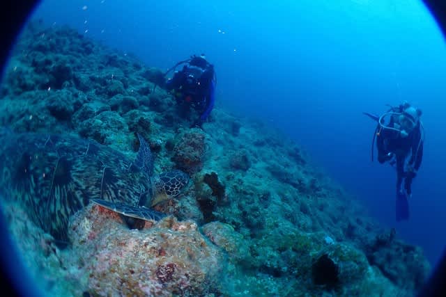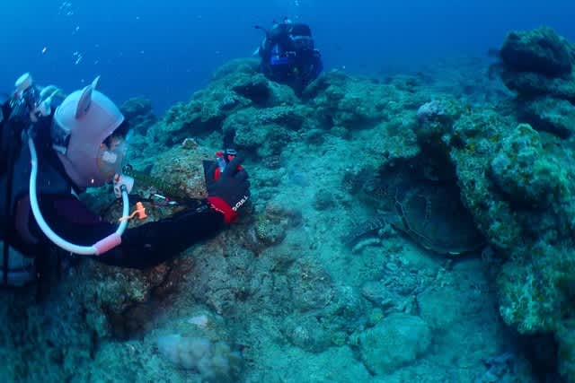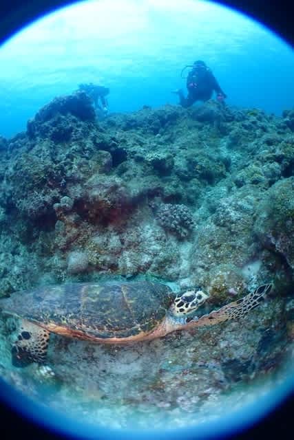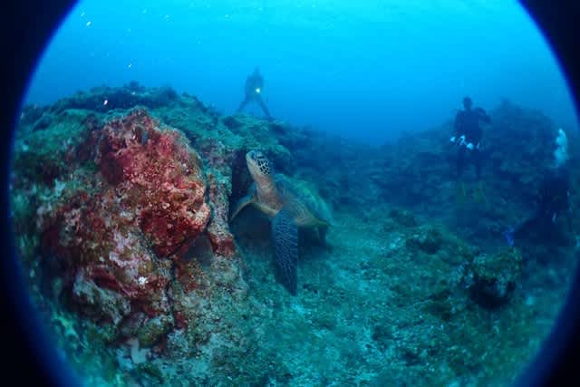三ツ石では、片手(左手)を失った、アオウミガメが逞しく泳ぐ姿も。