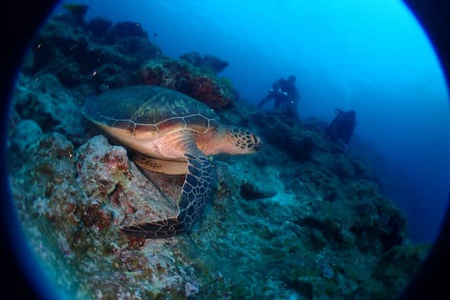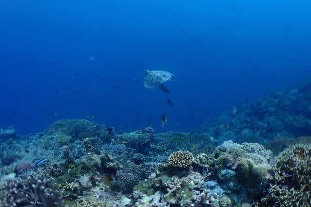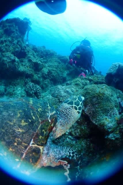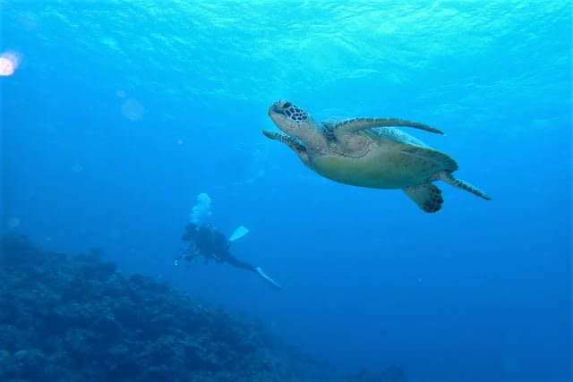 のんびり泳いでダイバーを案内してくれるアオウミガメさん🐢