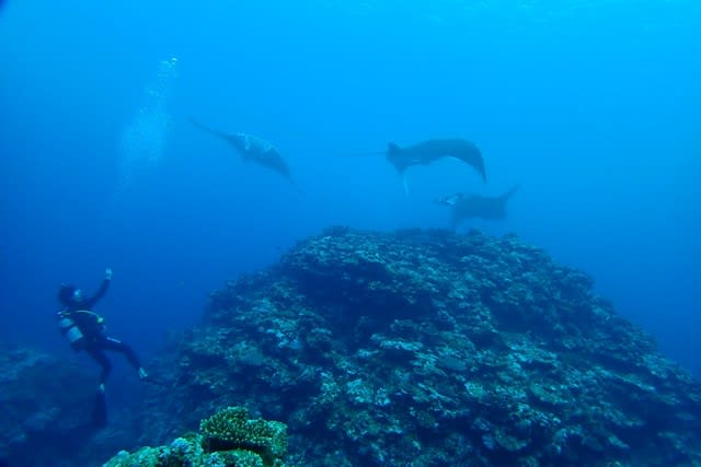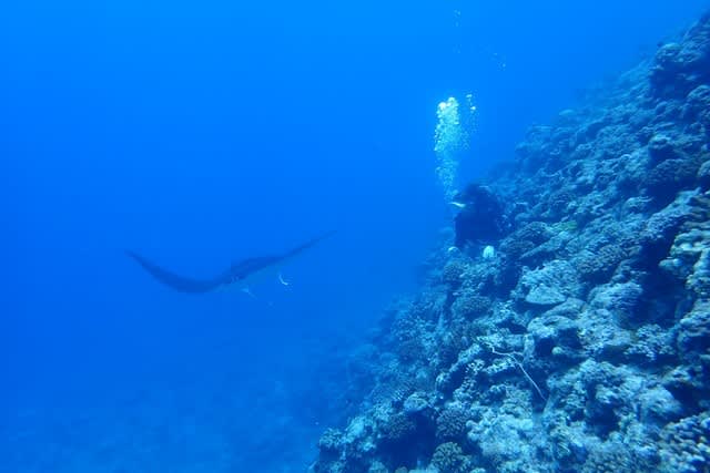 だんだん近づいてくるマンタがダイバーの真横を通り過ぎていきます。