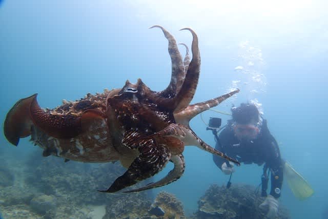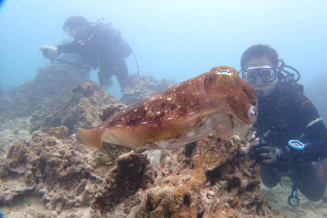2本目は、昨日の雨のおかげで透明度がすごく悪くてコブシメ見付けるのに一苦労しましたが