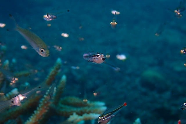 一つのサンゴに群れるスズメダイの幼魚(≧▽≦)