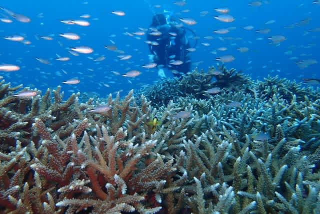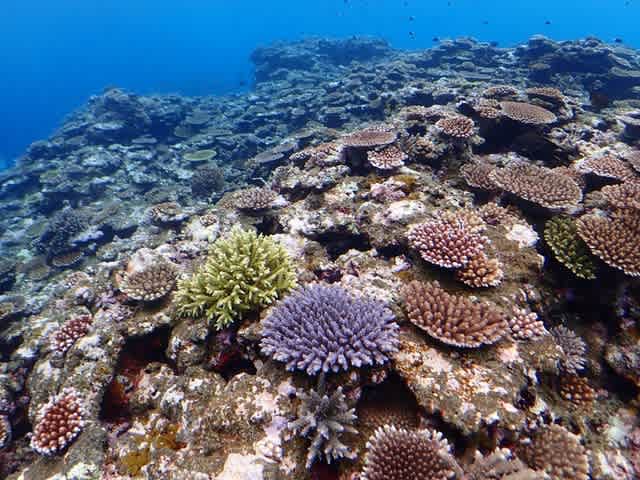 水面がベタ凪の時にはサンゴと水面のコラボが素敵です♪