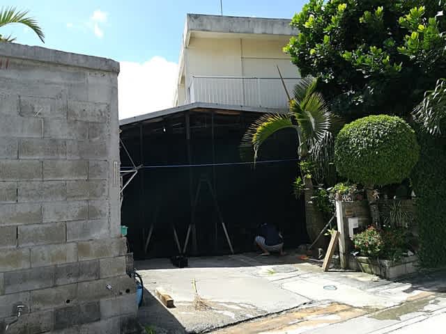 今日は、お店の周りにある木々を剪定して、防風ネットを張り、