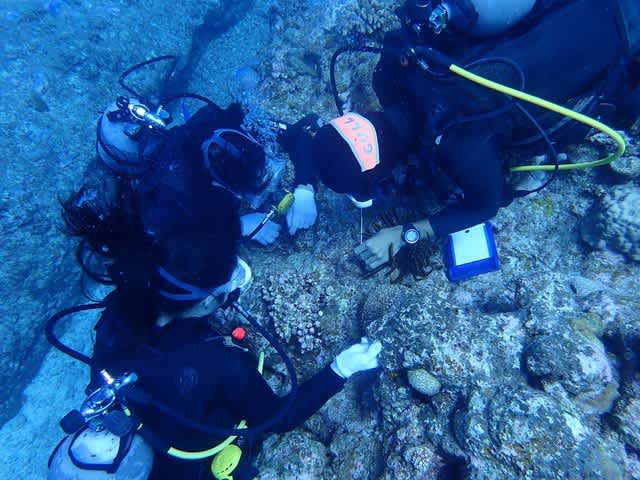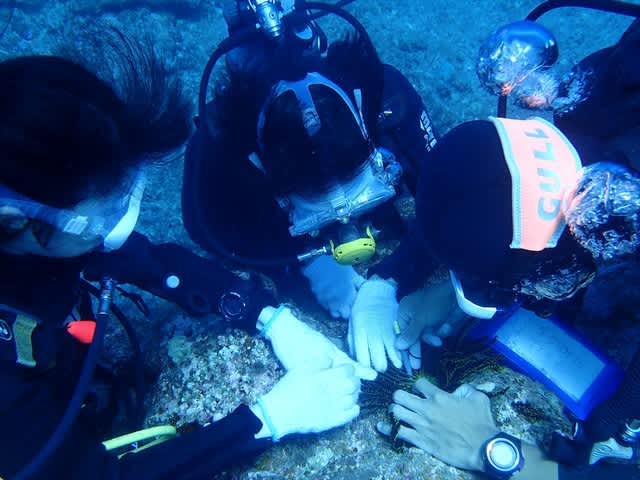 3人が頭を寄せてずぅーーーーっとウミシダの中にいるエビとカニを(笑)
