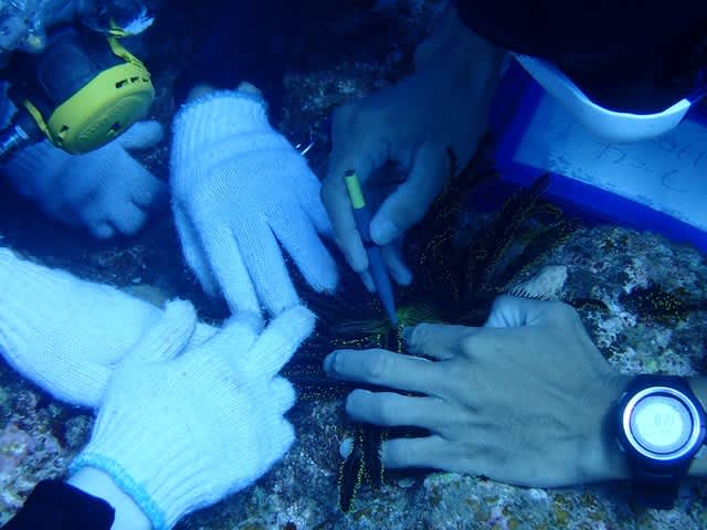 気になるお二人。気が付くとウミシダを抑える手(笑)
