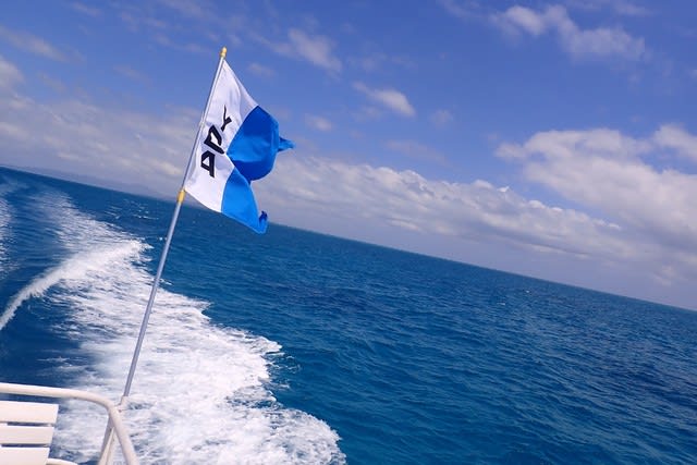 記念撮影した船首に向かって右側は青空広がる石垣島ですが