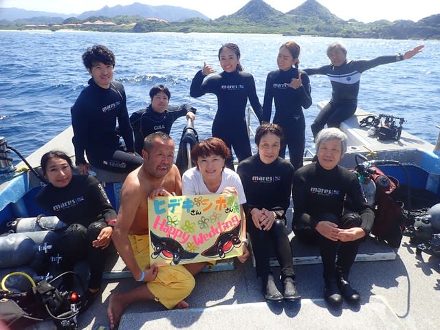 マンタの前にリピーターのコンノさん’シホさんのハピーウェディング集合写真を撮り