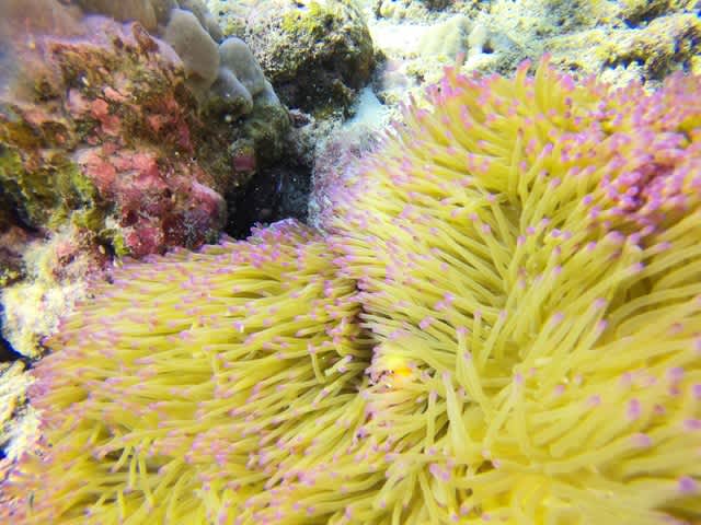 名蔵湾のユビエダハマサンゴに群生するスズメダイ達