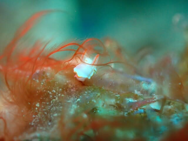 ぼけてますけど、栄養袋をもったイカの幼体です。