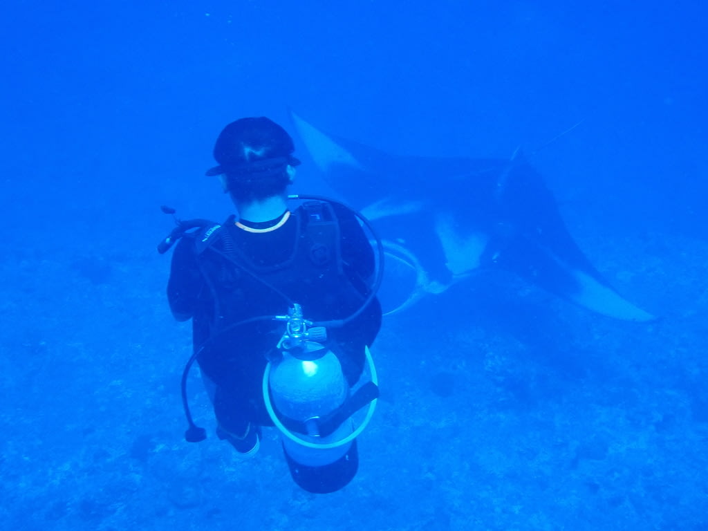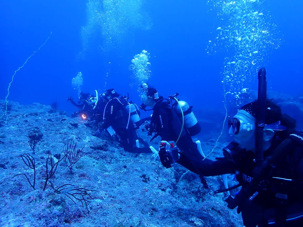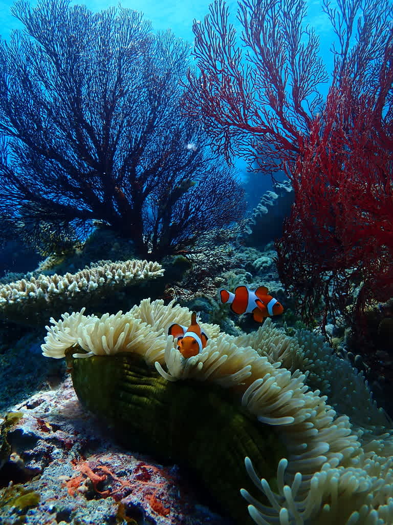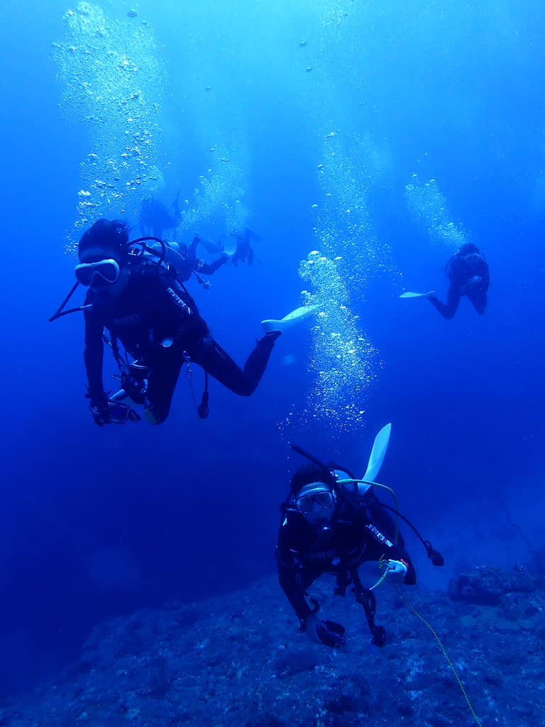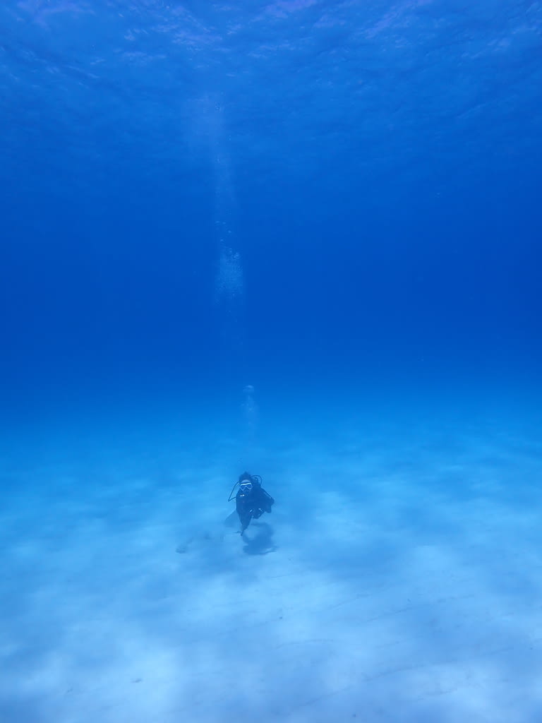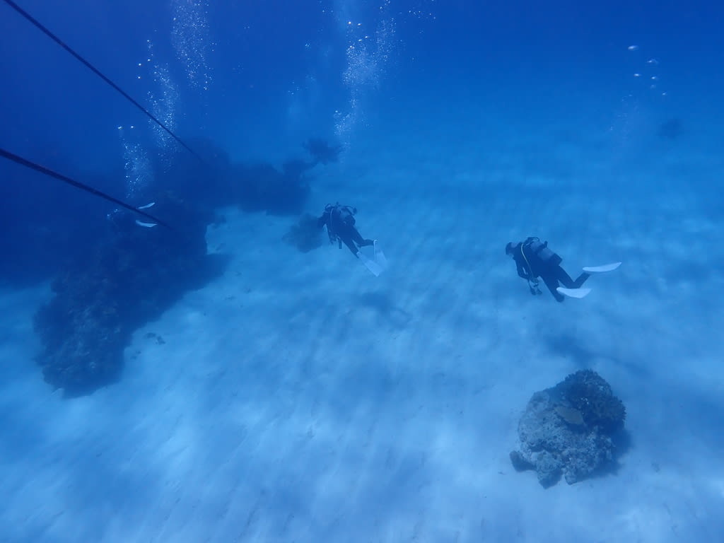 透き通る海に、太陽の光が届いて、白い砂地に影ができる。