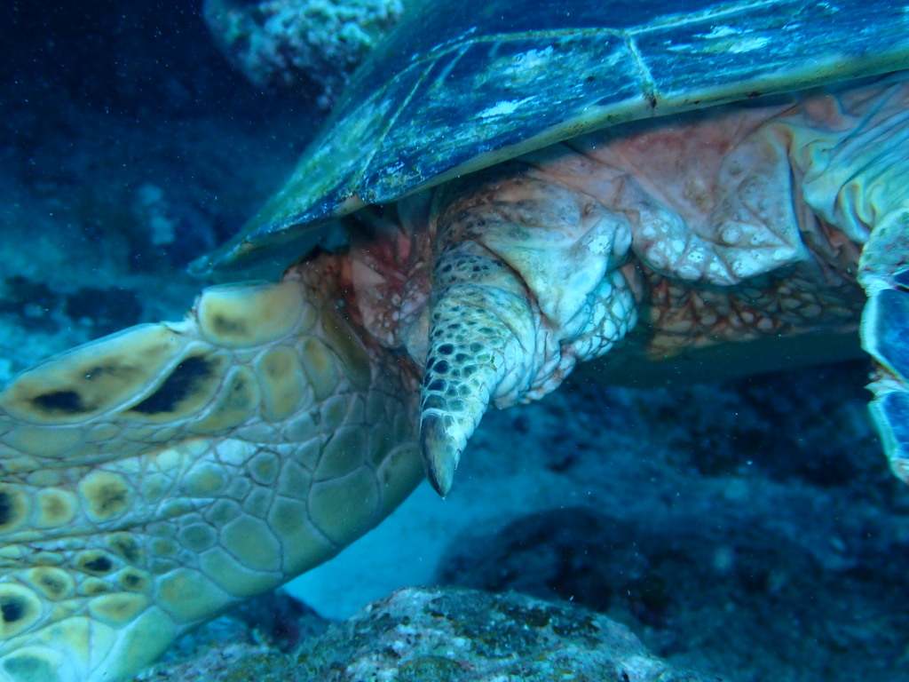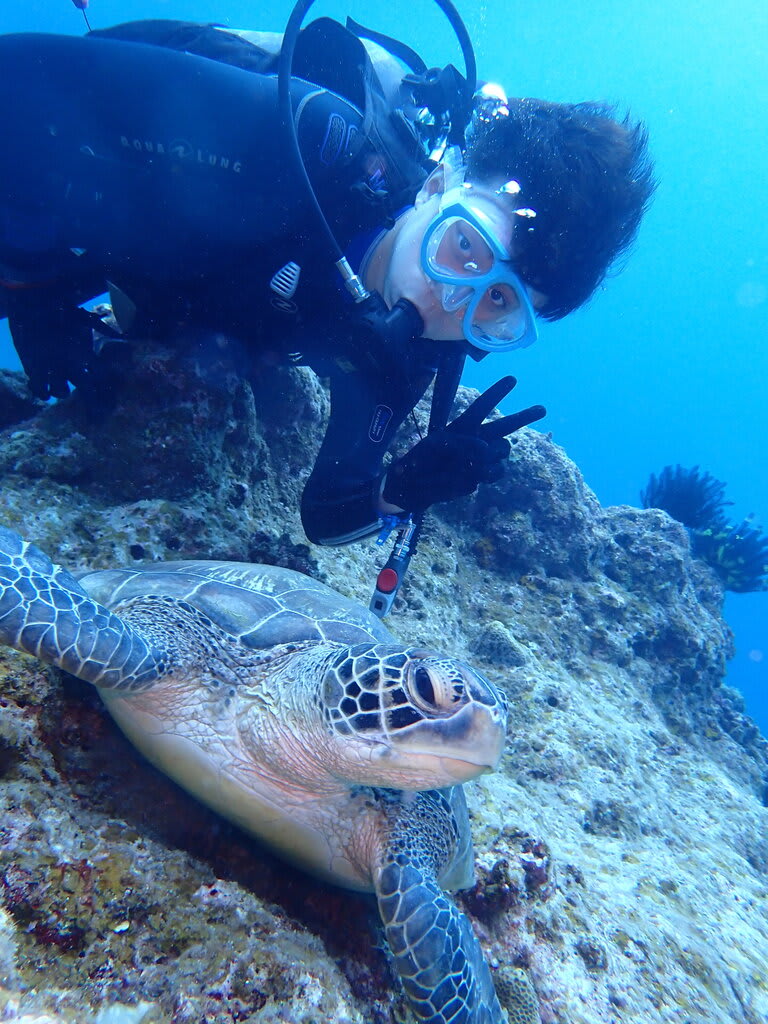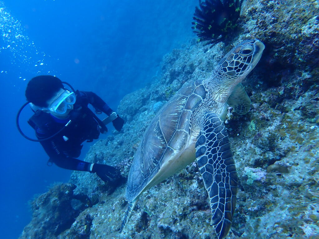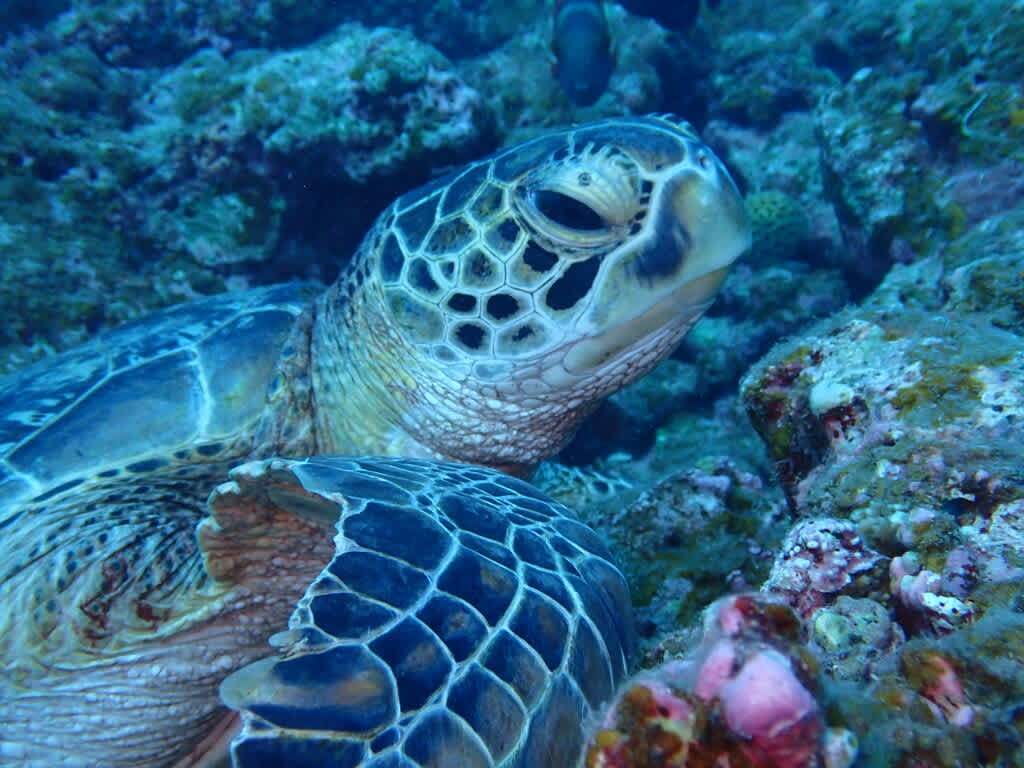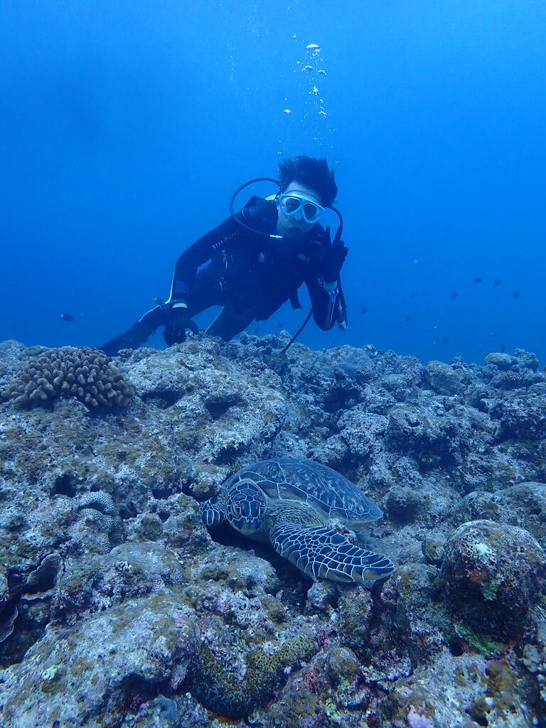 沖合いに目を向けると、ダイバー慣れしたカメがスイスイ~