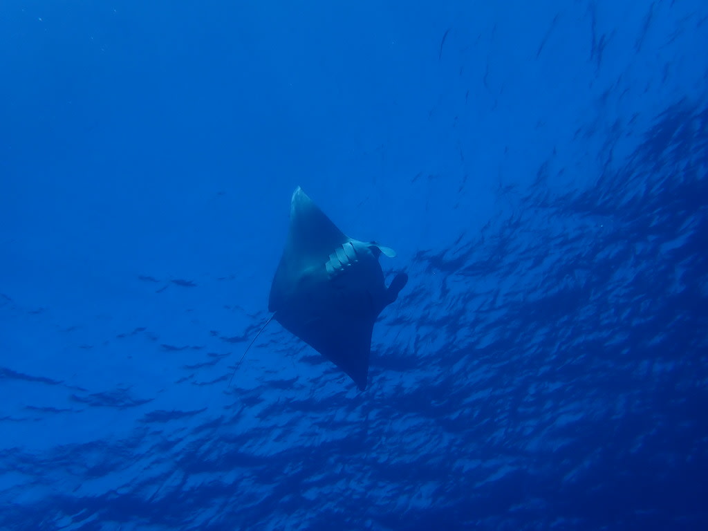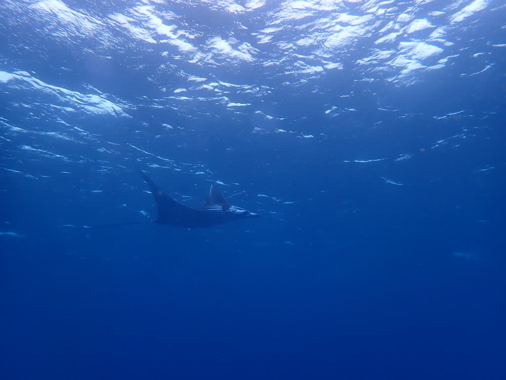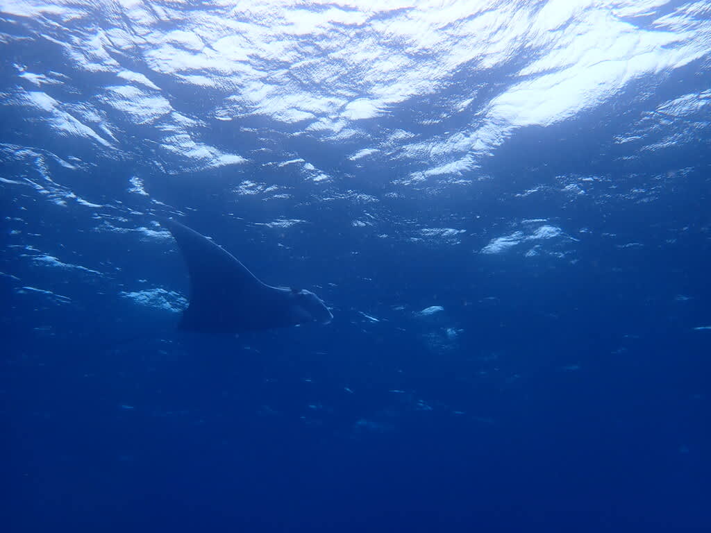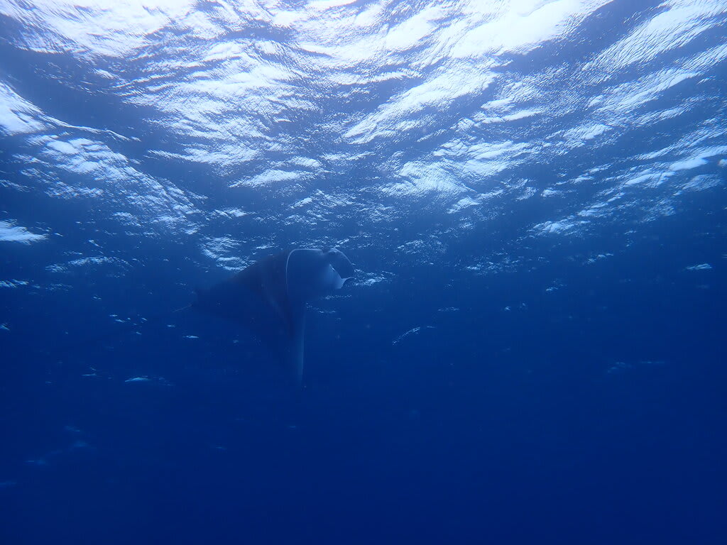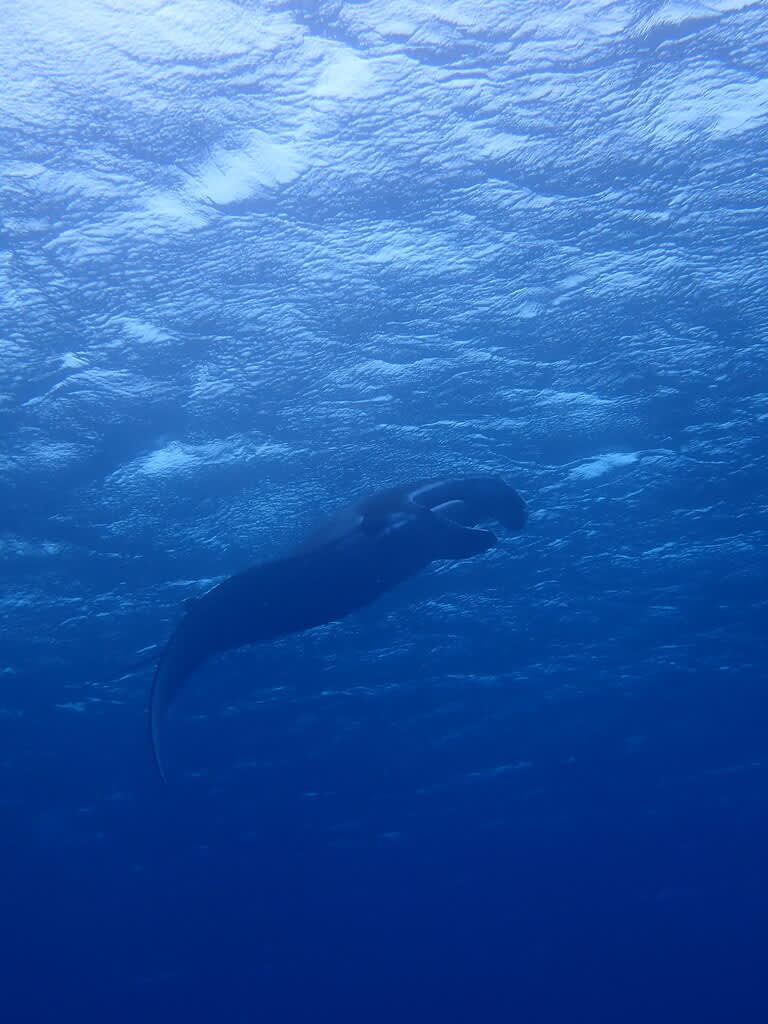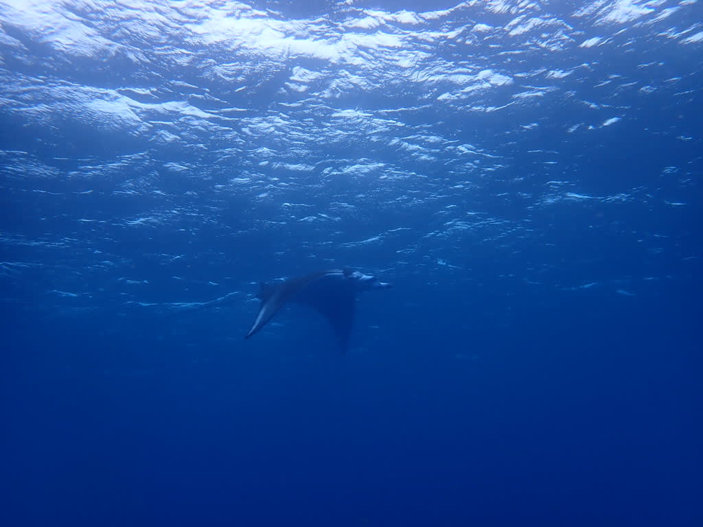 水面を泳ぐ大きなマンタとは、まったくもって対照的に