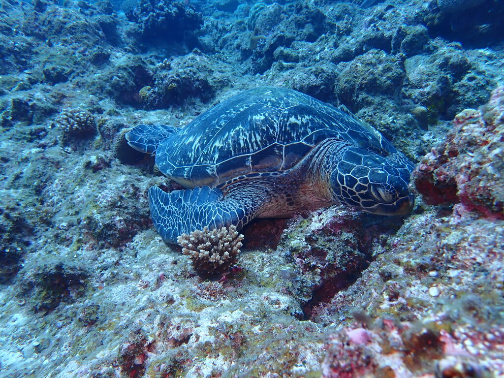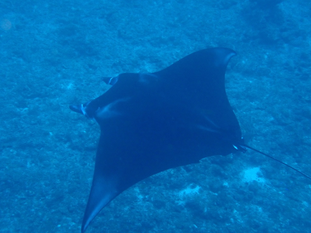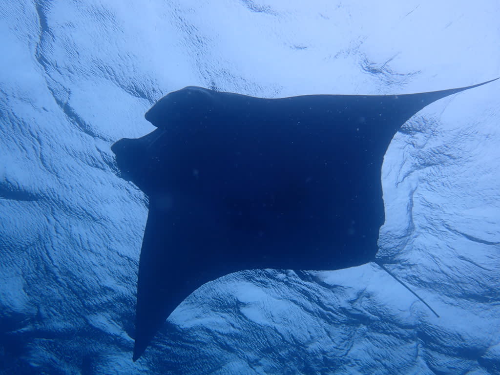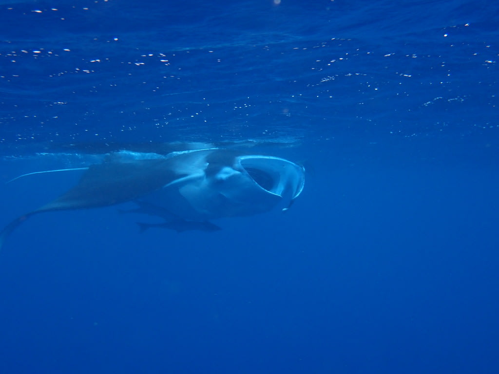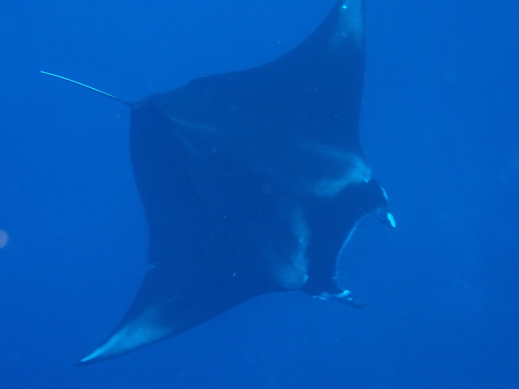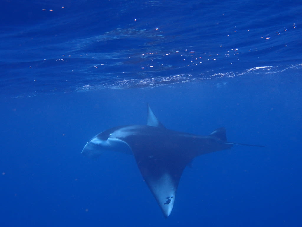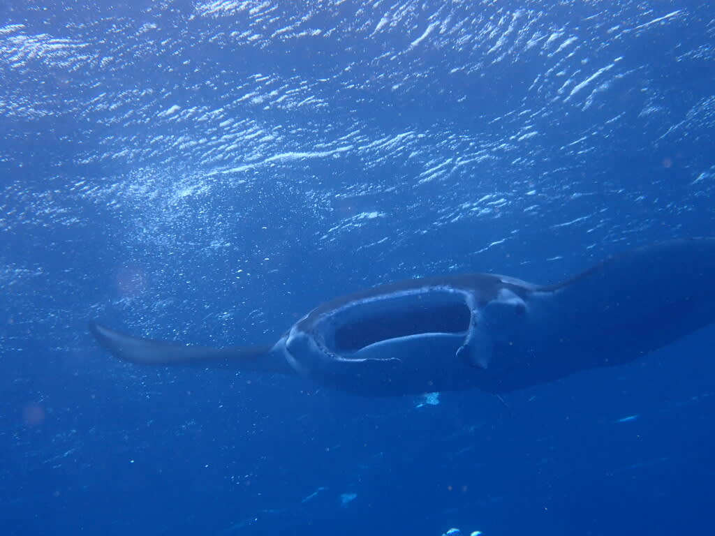 水面を泳ぐ大きなマンタとは、まったくもって対照的に
