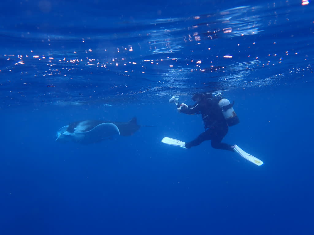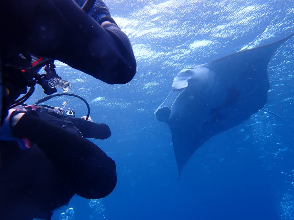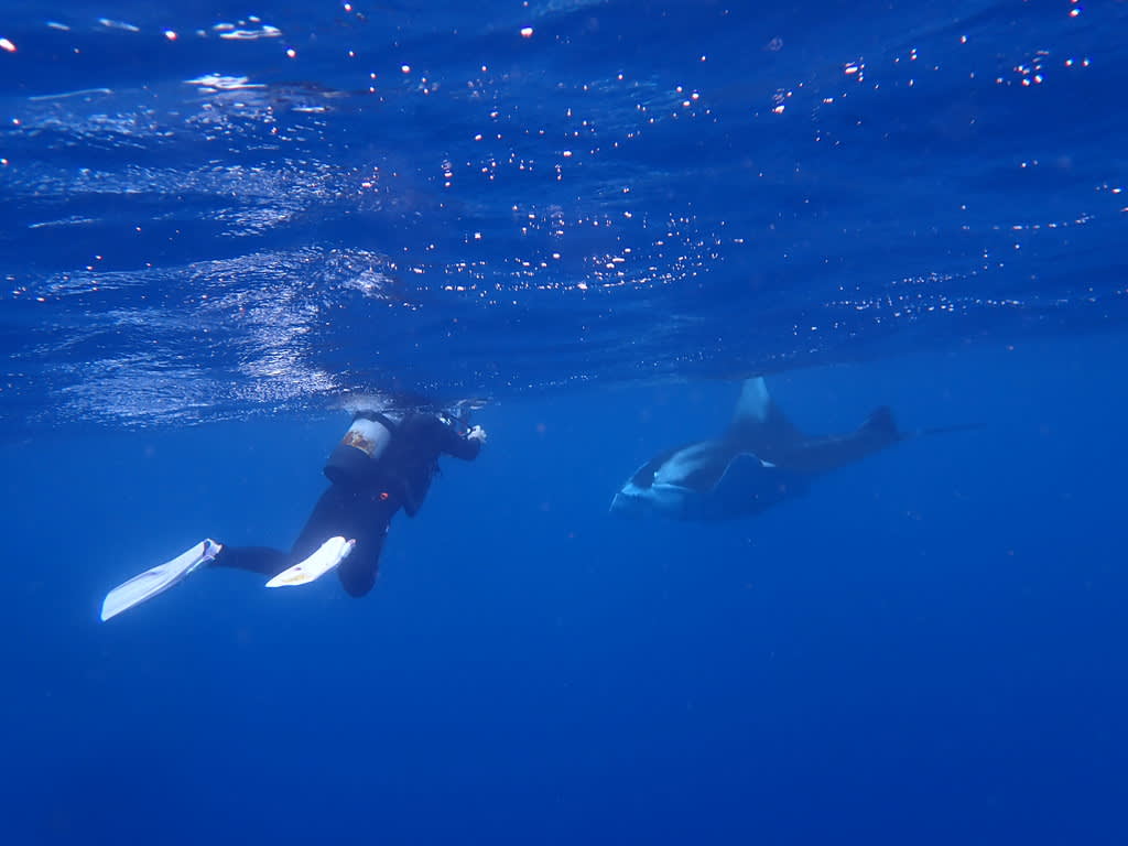 マンタに吸い寄せられるかのように近づくダイバーたち。