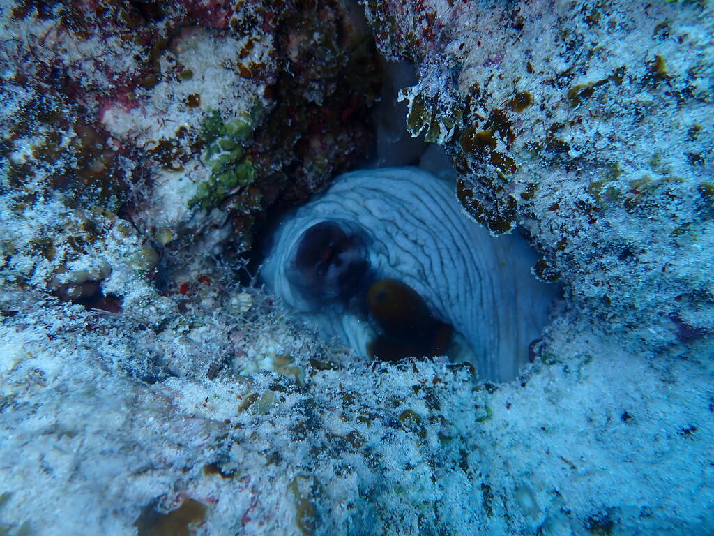 ハナヒゲウツボの幼魚は全く引っ込むことなく、、