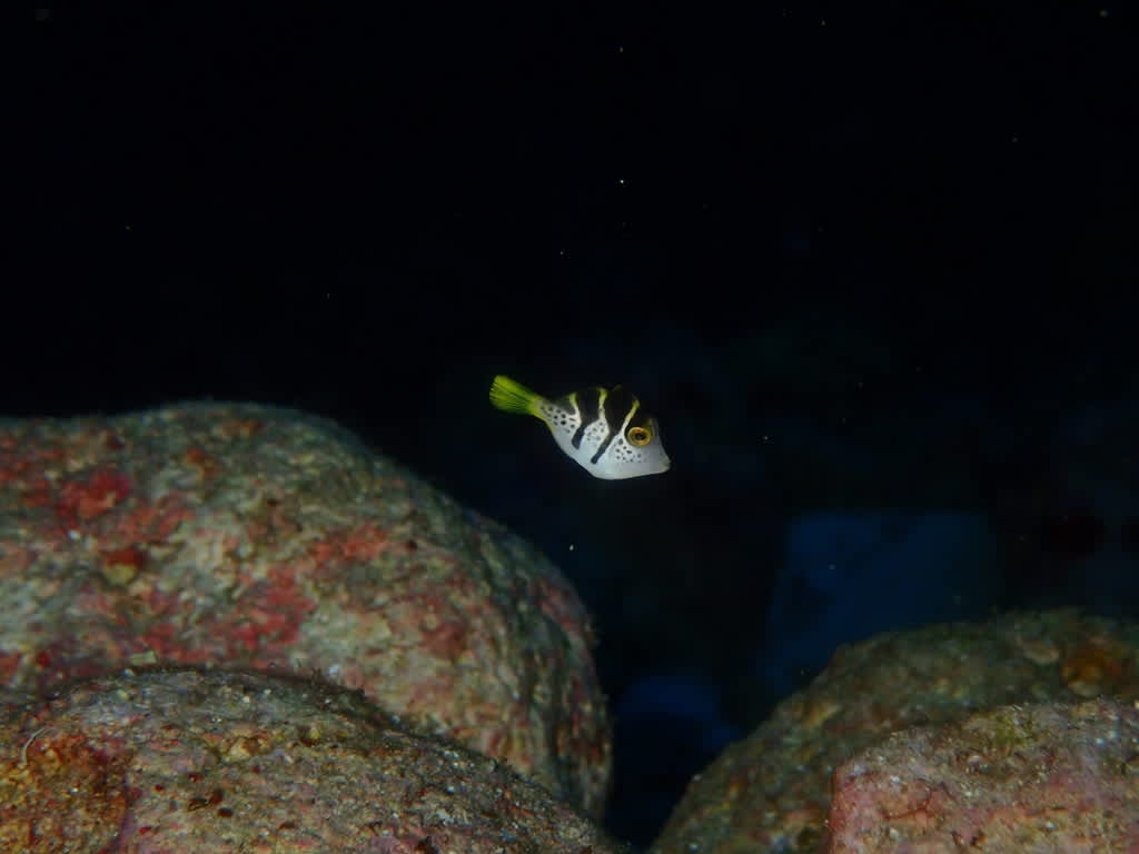 穴の出入り口に小指サイズのシマキンチャクフグが!